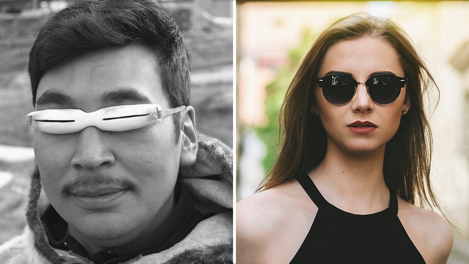 Though sunglasses might usually be mentally paired with poolside summer days, anyone who’s skied or snowboarded on a sunny day can tell you that the sun’s glare off the snow can be blinded. There’s a reason goggle tans are a thing. With that in mind, it’s not surprising that maybe the first people to ever say “hey man, f**k this” were prehistoric ancestors of the Inuit people, who made “snowglasses” by wearing usually whalebone eye covers with horizontal slits in them to limit glare and prevent snowblindness.