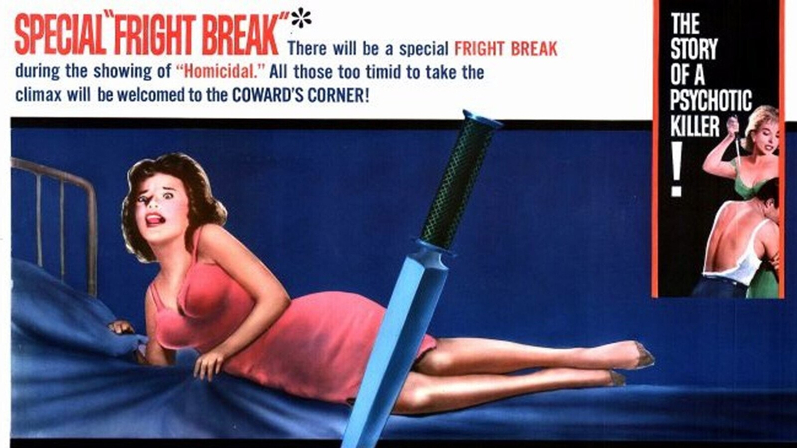 Here the story is the stuff of B-movie legend: Castle’s taunt offered to reimburse the ticket to people leaving the theater, but moviegoers instead stayed in their seats to see the following screening and then left the theater, thus indeed getting their money back. As a response, Castle’s natural solution was doubling down by creating yet another gimmick, the ‘coward’s corner,’ a literal corner in the theater with mocking sounds and signs where people would have to wait in order to be refunded.