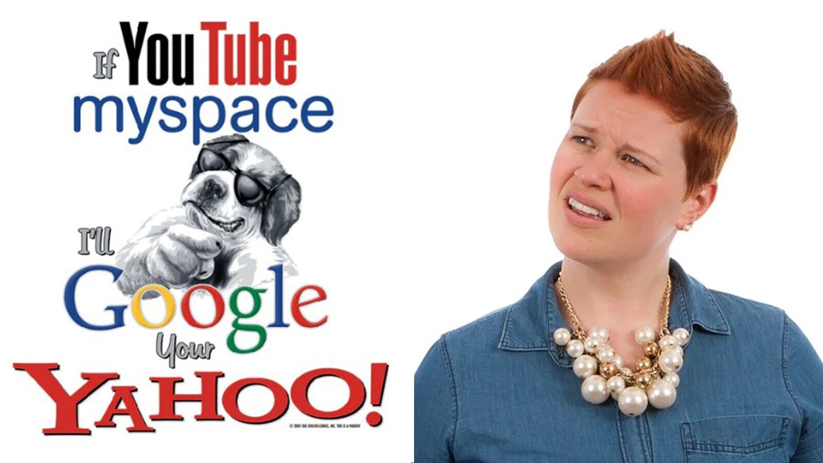 Ok, let's first just gloss right over the fact that they are still currently selling a t-shirt that references MySpace, which in internet time was literal eons ago. We still have to figure out what exactly the Big Dog is suggesting here. It is an absolute coin-toss between a physical threat and a sexual come-on. MySpace, I guess, could be standing in for “my space," as invading personal space is a big reference point for their shirts. I can't imagine any meaning for “Google Your Yahoo” outside of getting fingerblasted. For the life of me, though, I cannot figure out what verb “YouTube” is supposed to be standing in for.