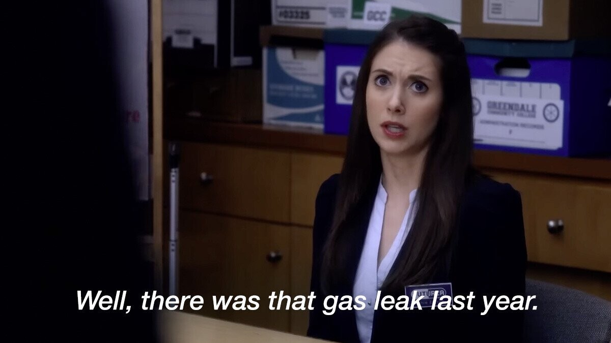 Oops. The Harmon-less Season Four, with several talented writers also abandoning ship, was a disaster for both critics and fans. Characters got weird, plots got hacky and the laughs got scarce. If it seemed like a different show, well, it was. Things got so bad that NBC rehired Harmon to fix the mess. But how to explain why things went so wonky for an entire school year? You guessed it: A community college gas leak.