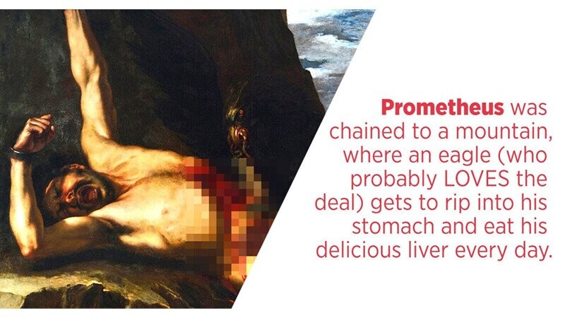 Unfortunately, the gods do not smile upon thievery or trickery. Prometheus paid for this bit of Oceanus Elevenus hijinks, and according to myth, is still paying for it today. If you think the old idea of an eye for an eye is brutal, consider this trade — fire for violent excision of your liver for eternity. Prometheus was chained to a mountain, where an eagle gets to rip into his stomach and eat his delicious liver every day. A liver which then magically regenerates just in time for eagle lunch tomorrow.