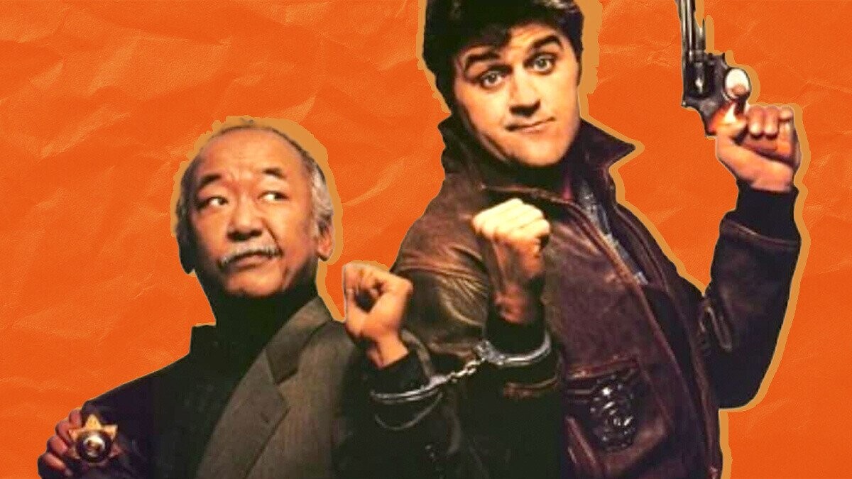 A hot-shot American cop teams up with an investigator from a distant Asian country. Cultures clash. Bad guys get killed — who are you picturing in the lead roles? Jackie Chan and Chris Tucker? Well, how about Mr. Miyagi and the guy later known for clipping out amusing newspaper headlines and making fun of Bill Clinton instead?