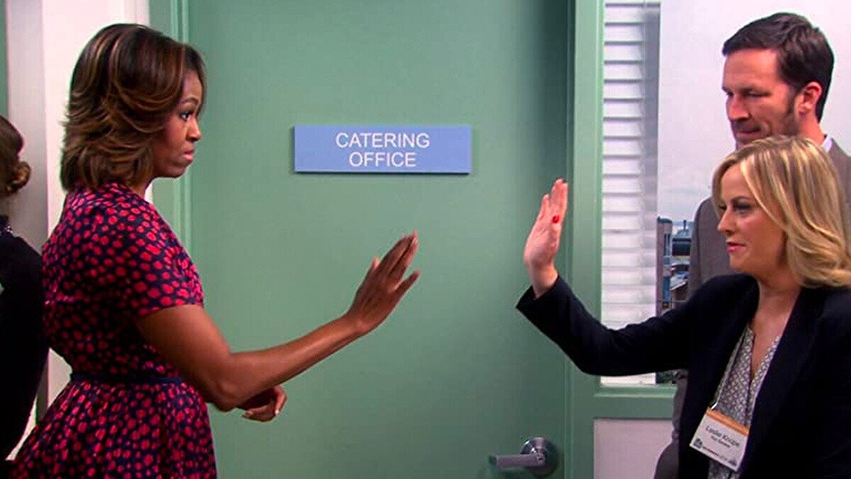 The former First Lady does a perfect job playing the straight woman as Leslie has a minor meltdown and is unable to control the volume of her voice before attempting the world’s awkwardest high five.