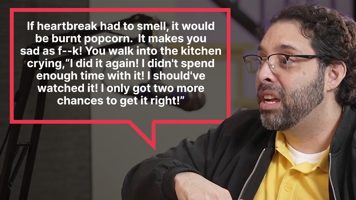 “If heartbreak had to smell, it would be burnt popcorn. You smell burnt popcorn? It makes you sad as fuck. You walk into the kitchen crying, you can smell it. You’re going, ‘(sniff) Oh fuck, I did it again! I didn’t spend enough time with it! I should’ve watched it! I only got two more chances to get it right!’”