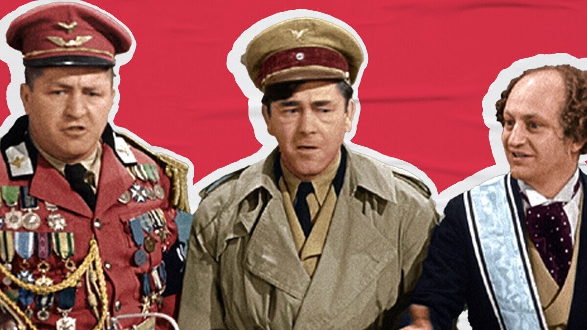 In it, Moe plays Hitler stand-in “Moe Hailstone”; Curly plays “Curly Gallstone,” a parody of German military leader Hermann Göring; and Larry was propaganda minister “Larry Pebble,” a takeoff on Joseph Goebbels. They begin the short as wallpaper hangers when the leaders of the country “Moronika” decide they need a dictator and they hand Hailstone the job. From there, Hailstone delivers some very Hitler-esque speeches, declares some books to be burned and sends his political enemies to a “concentrated camp.” (In the end, all three of them are fed to lions.)