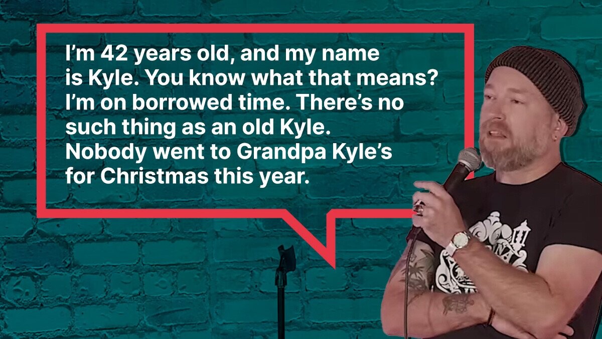 “I’m 42 years old, and my name is Kyle. You know what that means? It means I’m on borrowed time. There’s no such thing as an Old Kyle. You’re trying to think of one right now. Don’t, you can’t. There isn’t any. Nobody went to Grandpa Kyle’s for Christmas this year. Kyles die in their early 20s in free-climbing accidents, the way God intended. Right now, there’s five different Kyles that are just piles of bones and Patagonia windbreakers, thawing out at the base of Half Dome, waiting for a hiker to find him. When a Kyle dies, Red Bull sends flowers to the funeral.