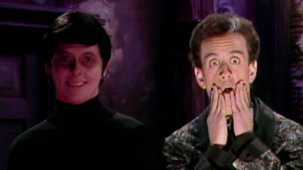 Before Kids in the Hall debuted, McDonald and Foley were a comedy duo, and some of the best stuff on the show was just the two of them goofing around. They played failed vaudevillians and hopeless sad sacks, but their most memorable recurring characters were two gothic morons who hosted a show about Satanism called The Pit of Ultimate Darkness. Sir Simon Milligan (McDonald) was the mugging, excitable host while his childish man-servant Hecubus (Foley) would commit a bunch of underwhelming evil deeds, like ruining the end of a movie for Simon or simply double-parking in front of Simon’s car.