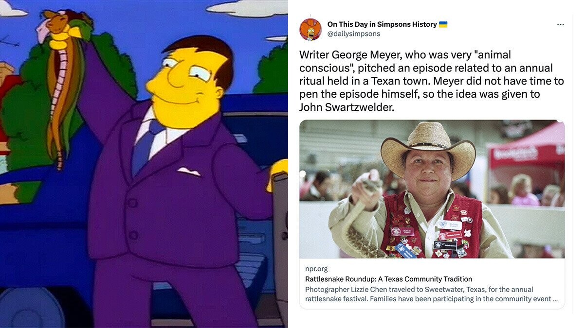 Unlike some of Springfield’s more fantastical traditions, Whacking Day actually has its roots in a 100 percent real, non-animated event. According to long-time Simpsons showrunner Al Jean, the idea first came from writer George Meyer, an animal rights advocate who “wanted to do an episode about this actual ritual in a Texas town … where one day a year they whack rattlesnakes with sticks.”