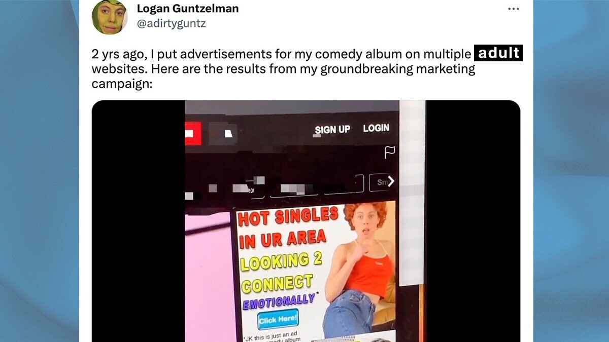 L.A.-based comedian Logan Guntzelman has an affinity for atypical advertising that led to a brief-but-memorable marketing campaign for her 2020 album Today’s Top Hits!. For one week, Guntzelman ran sidebar ads on certain websites where few advertisers dare to tread, except for those selling “Sex With Local Singles” or devices that supposedly turn disappointing dicks into giant throbbing snake monsters.