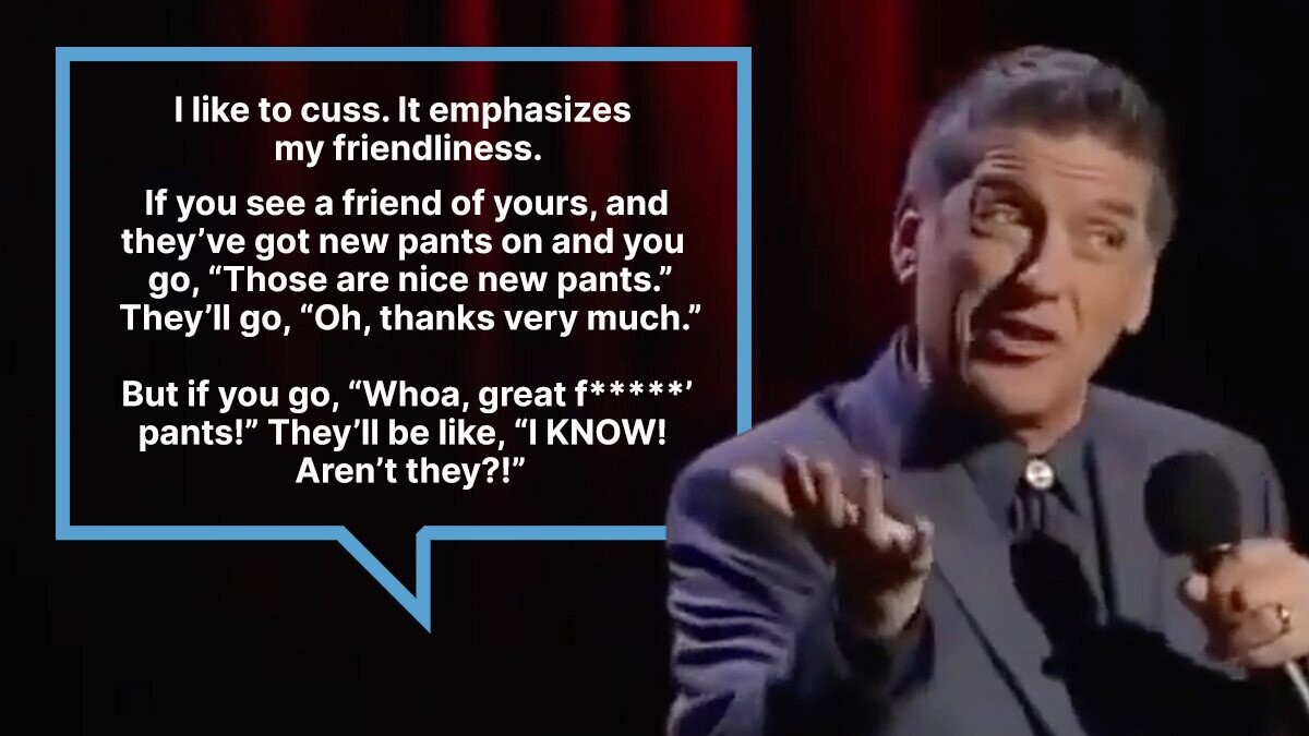 “I like to cuss. It helps me be friendly to people. It emphasizes my friendliness. Like, if you see a friend of yours, and they’ve got new pants on and you go, ‘Oh, those are nice new pants.’ They’ll go, ‘Oh, thanks very much.’ But if you go, ‘Whoa, great fuckin’ pants!’ They’ll be like, ‘I know, aren’t they? I saw them in the store I was like fuuuuuck!’”