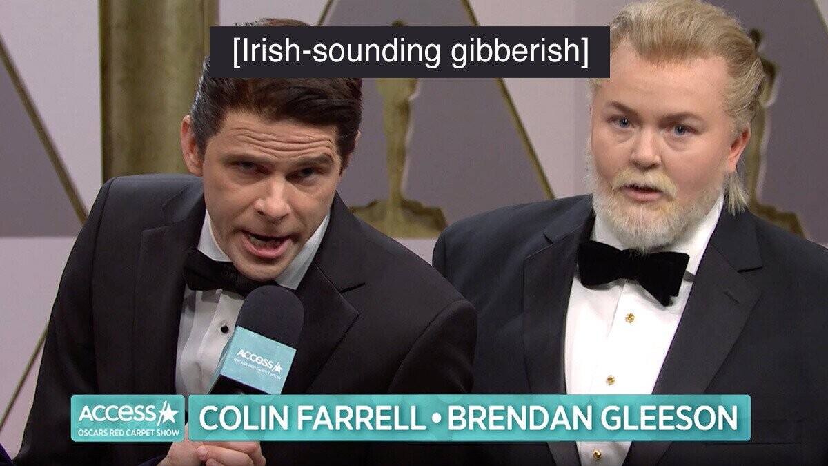 Mikey Day plays Farrell here, with Molly Kearney imitating his fellow Oscar nominee Brendan Gleeson. The joke: The Irish actors’ brogue accents are so thick that no one can understand a single word. Just in case Farrell wasn’t properly insulted yet, SNL’s Oscar red-carpet host followed up with: “Wow! And they haven’t even started drinking yet!” (Farrell swore off alcohol in 2006, then checked into a rehab facility in 2018 as a “pre-emptive measure.” Ha ha ha!)