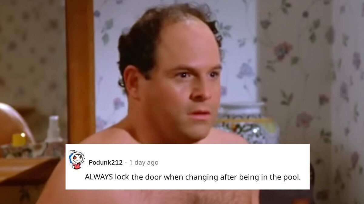 So simple, George, yet so painful. Who changes out of a wet swimsuit without first securing the door, especially if the water was cold? Stupid George gets the shortchanging he deserves.