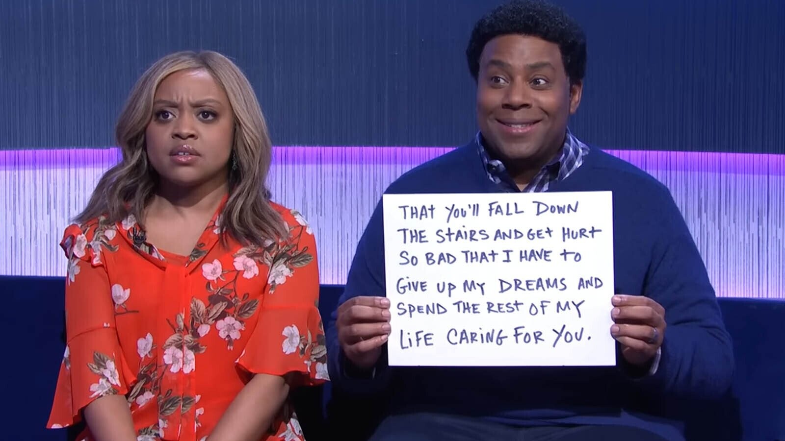 Couple Goals, hosted by Bob Dabilda (terrible pun but a great straight-man turn by James Austin Johnson), featured Brunson and Thompson as idyllic married couple Thomas and Mia, facing off against the mismatched pandemic pair John and Linda (Michael Longfellow and Punkie Johnson). It’s pretty clear from the start that Thomas and Mia are the more perfect match, knowing virtually everything about one another. Except, of course, the one thing.