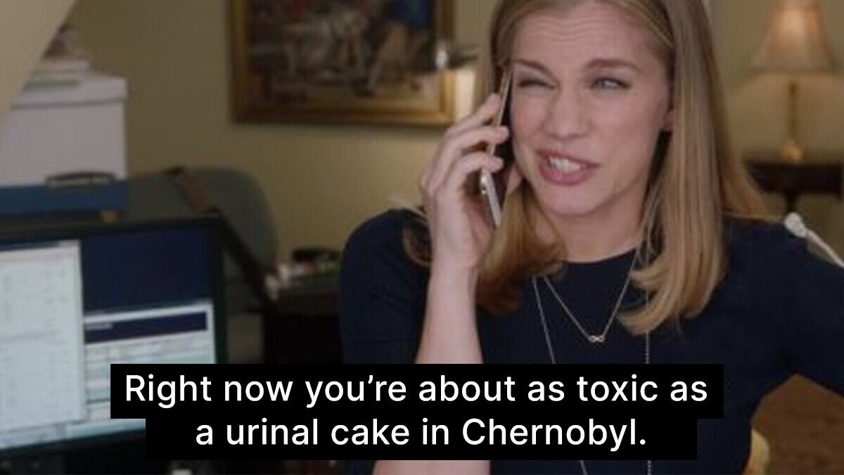 Amy and Dan are constantly at each other in a “will they, won’t they” sitcom situation that thankfully never goes full cliché. While Amy seems to have an entire diary dedicated to jogging down insults for Dan, the one where she tells him that “you're about as toxic as a urinal cake in Chernobyl" takes the, uh, proverbial cake.