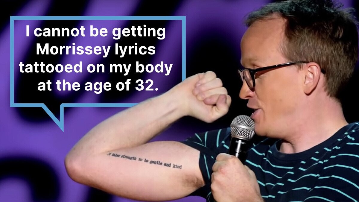 Telling the story of getting “It takes strength to be gentle and kind” tattooed on his arm: “I cannot be getting Morrissey lyrics tattooed on my body at the age of 32. That is not acceptable. I’m not a sad 19-year-old college kid anymore. I can’t be getting Morrissey tattoos. I can feel this whole room saying to themselves, ‘It’s a cheesy tattoo, but it’s not the worst one I’ve ever heard of.’ But what you don’t know is I already had the word Morrissey on the same arm. Unacceptable. Unacceptable behavior."
