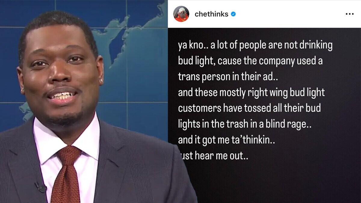 The Bud Light controversy has a lot of people thinking, including Saturday Night Live’s Michael Che. The Weekend Update anchor has a habit of posting his opinions to Instagram, then quickly deleting them, but he’s keeping this one up for now. It’s a proposition in two parts: