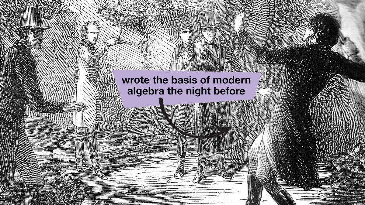 The winner of the duel would get some prize. It might be as small as a dinner, with the loser paying. It might also be a position at a university, while the loser might lose their career altogether and never recover. These duels didn’t end in death, as they involved no physical combat. We just really wanted to talk about them anyway. However, we also promised you stories of death, so let’s jump away from 16th-century Italy and tell you about one duel that really did kill a mathematician. His name was Évariste Galois, and a bullet in the belly killed him in 1832.