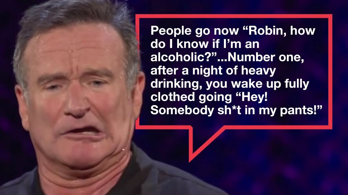 “People go now, ‘Robin, how do I know if I’m an alcoholic?’ Well, as one, let me give you some warning signs. Number one, after a night of heavy drinking, you wake up fully clothed going, ‘Hey! Somebody shit in my pants!’”