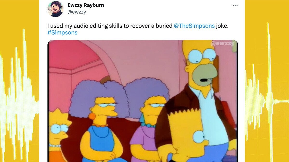 No one, that is, until now. Twitter user and pro video editor Ewzzy Rayburn used his audio production skills to isolate the lost joke, identifying and erasing the high-pitched tone and then boosting Marge’s voice to a more clearly understandable level.