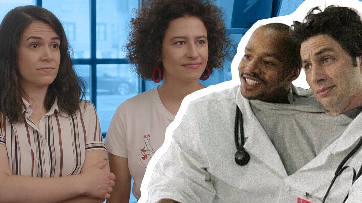 J.D. (Zach Braff) and Turk (Donald Faison) have been friends through college and medical school; as Scrubs (streaming on Hulu) begins, they’re still roommates while going through their internships at Sacred Heart Hospital. Some of the language around their intensely close friendship hasn’t aged well since the show’s 2001 premiere — as a culture, we more readily understand that men can express platonic love without yelling that they are straight — but overall, the purity of their affection for each other is still more sweet than sour.