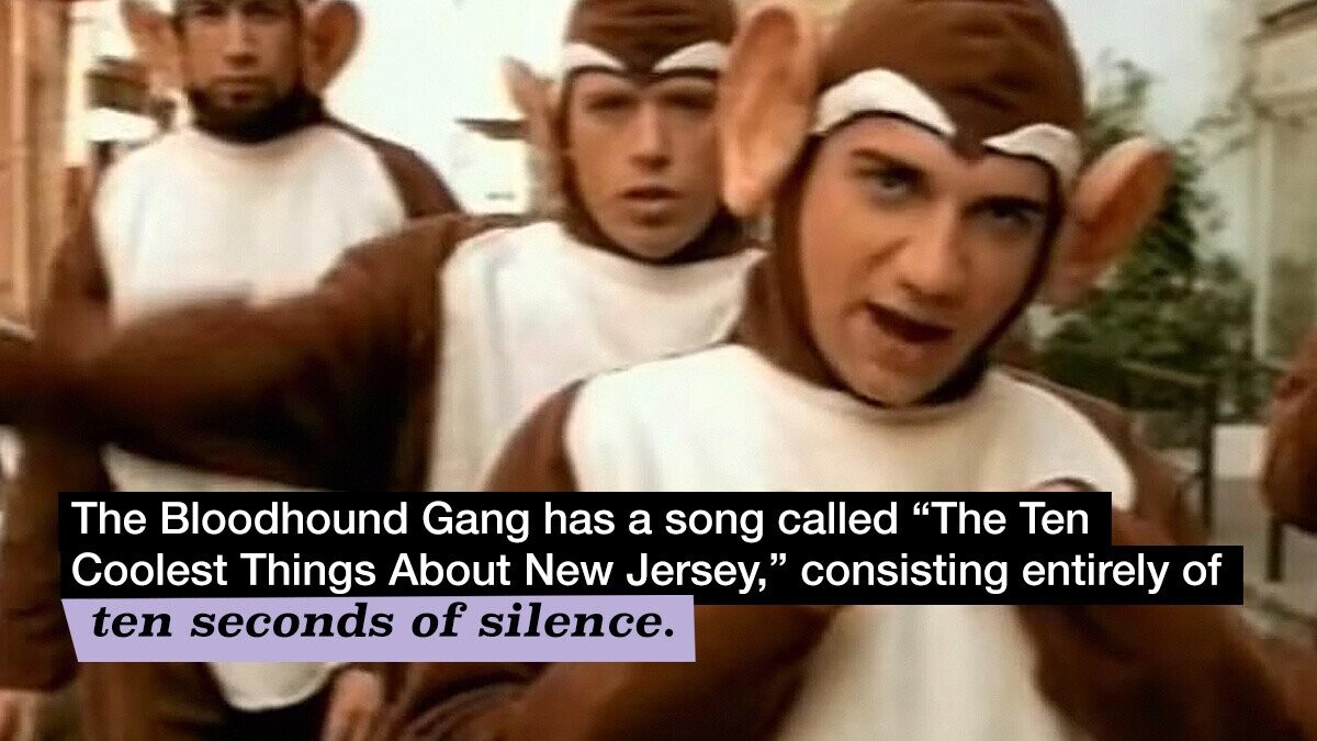 The Bloodhound Gang’s album Hooray for Boobies featured a song called “The Ten Coolest Things About New Jersey.” The song consists of 10 seconds of silence.