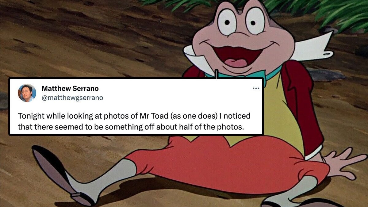 Or, so we thought, until filmmaker and theme park aficionado Matthew Serrano blew the lid off of the biggest wardrobe malfunction of 1949 when he noticed an unseemly detail during a viewing of the animated Disney adaptation of The Wind in the Willows. Mr. Toad is more of an exhibitionist than we ever could have imagined.