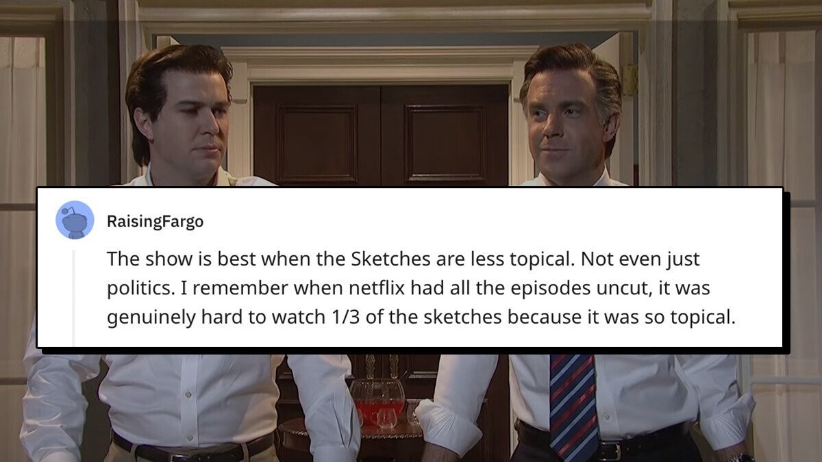 “The show is best when the sketches are less topical. Not even just politics. I remember when Netflix had all the episodes uncut, it was genuinely hard to watch 1/3 of the sketches because it was so topical.” (u/RaisingFargo)