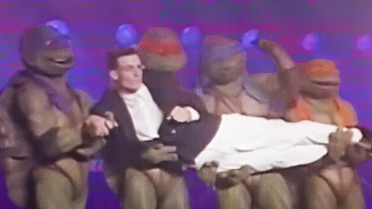 After Ice turned in the track, he discovered he and “Ninja Rap” would be integrated into the movie — and in a pretty important part, too. In one of The Secret of the Ooze’s climactic scenes, the Turtles battle their mutant foes Tokka and Rahzar, their hand-to-hand combat sending them crashing into a venue where fans are innocently enjoying a Vanilla Ice gig. Although briefly thrown by this shocking development, Ice suddenly gets inspired to start performing “Ninja Rap,” presumably making it up on the spot. (Even more impressive, he and his dancers know some tight moves for this brand-new song.) It’s an incredibly hokey sequence — at one point, respected theater and character actor David Warner (who plays a kindly scientist) starts grooving to “Ninja Rap” — and when Pressman appeared on Turtle Tracks (a Turtles-themed podcast hosted by Cracked’s Brian VanHooker), he diplomatically hinted that maybe that wasn’t his favorite part of the shoot.