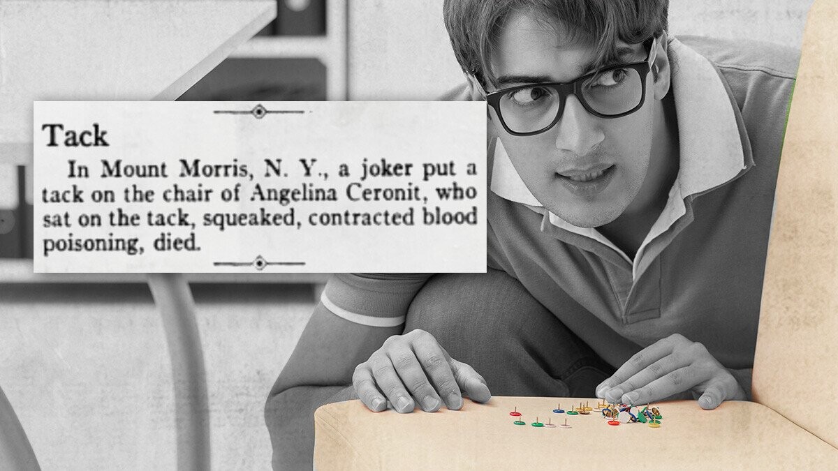 In 1930, a high school student fell victim to this seemingly innocuous prank but then got sick and died a few days later from “the blood poisoning the tack had introduced into her system.” The sad incident even made it into the pages of Time Magazine (although they didn’t exactly go overboard with the details).
