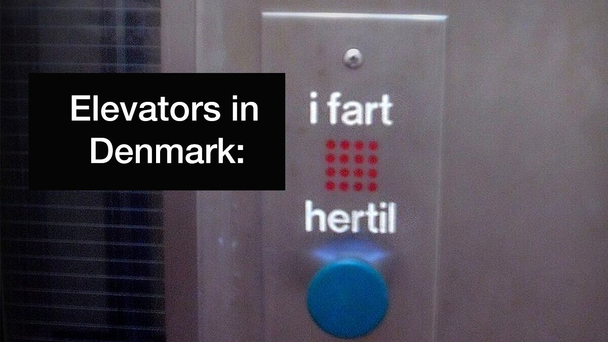 “I fart” means “in motion” in Danish. Go to Denmark, and you’ll see elevators light up with the sign “I fart.”