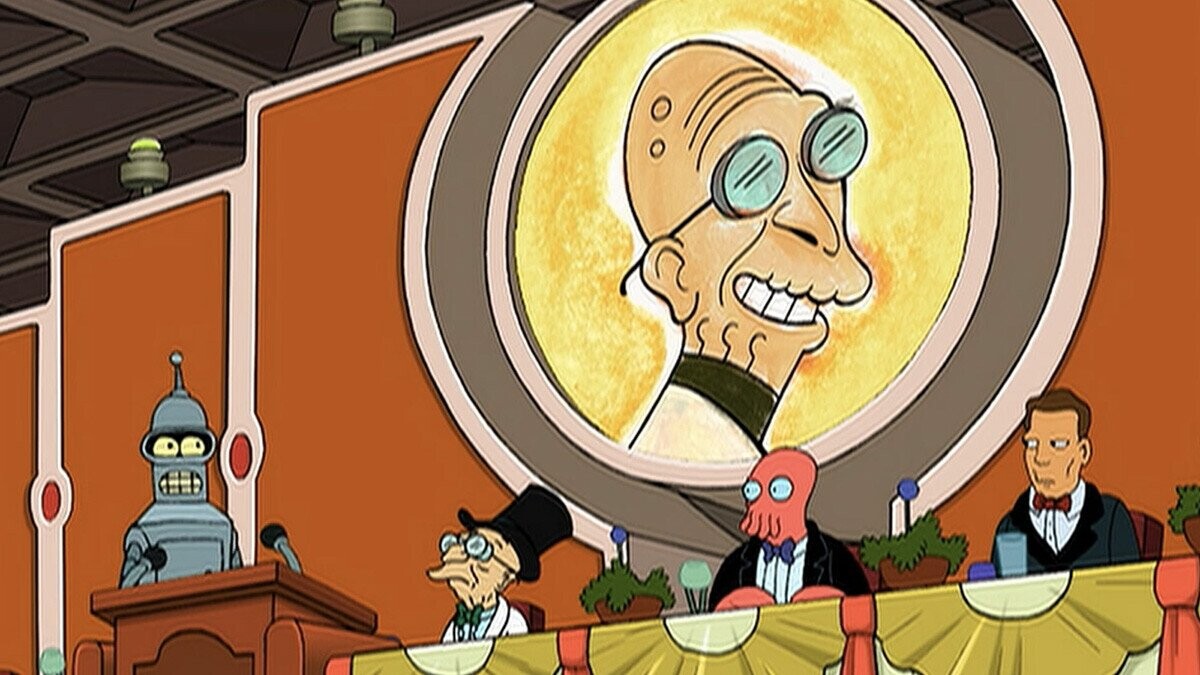 Reason for the Roast: Professor Farnsworth (voice of Billy West) believes he’s being summoned to Mars University for a hearing on disciplinary charges. (“Everyone’s always in favor of saving Hitler’s brain, but when you put it in the body of a great white shark, ooh, suddenly you’ve gone too far!”) But it turns out to be a ruse to lure him to Hallowed Hall for a 150th birthday roast.