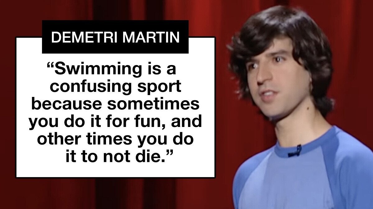 “Swimming is a confusing sport because sometimes you do it for fun, and other times you do it to not die. And when I’m swimming, sometimes I’m not sure which one it is. I gotta go by the outfit. Pants? Uh oh. Bathing suit? Okay. Naked? We’ll see. Should I be swimming faster, or am I getting laid?”