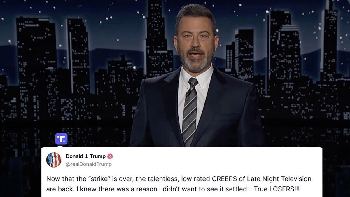 Trump’s message “almost reads like a network promo,” joked Kimmel, tossing to a fake promotional spot for Jimmy Kimmel Live’s return. “The true losers are back!”