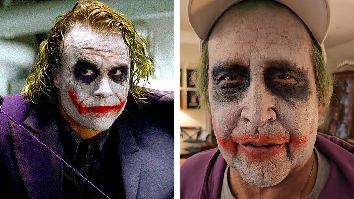 One stolen Reese’s Peanut Butter Cup later and we’re back in the Chase house where his wife gets to work on his eerie transformation. Chase can’t be bothered to take off his golf cap, but that doesn’t lessen the terror when he turns to face the camera — AS THE JOKER! — to whisper Ledger’s signature line: