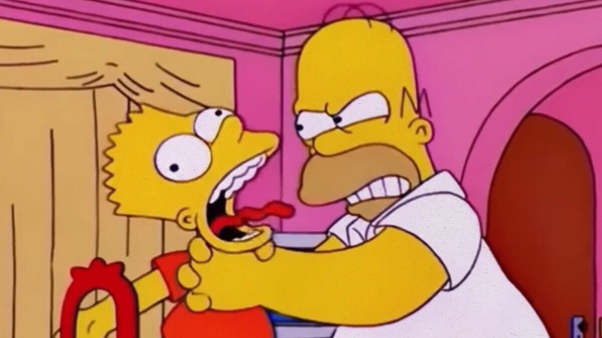 In the recent Simpsons episode “McMansion & Wife,” Homer made the rare meta joke after his new neighbor complimented his strong hand shake, quipping to his wife, “See, Marge? Strangling the boy has paid off! Just kidding, I don’t do that anymore. Times have changed.” This semi-official retirement of the antiquated abuse joke came after a multiple-season absence of the iconic image of Homer holding Bart in the air by his neck and brutally throttling the boy whose outstretched tongue and tortured gasps for air were, at one point, peak family comedy.