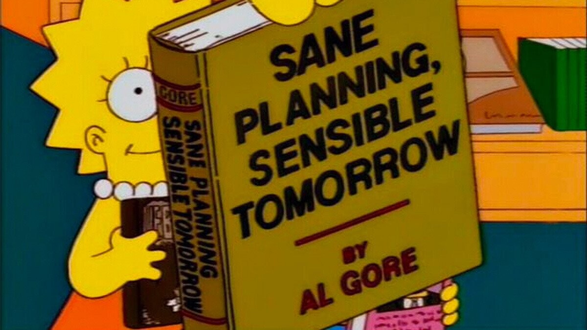 The world of The Simpsons is chock-full of fake media that sparks the imagination. From Stop This Planet of the Apes, I Want To Get Off! to Lee Carvallo’s Putting Challenge so many fictional pieces of entertainment make us envious of the Springfield denizens who get to enjoy the parodical properties that are usually more enticing than our real-world fare. As such, I can’t help but feel slightly jealous for the fictional characters who hold cards for the Springfield Public Library and the countless tomes of satirical literature it must contain. But, sadly, if I want to get all the necessary information for sane planning and sensible tomorrow, I’ll have to talk to the real Al Gore.