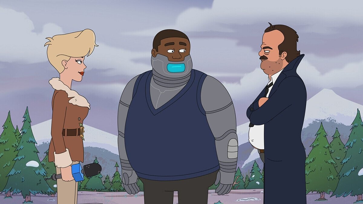 In Grimsburg, the latest addition to Fox’s Sunday-night Animation Domination programming block, Hamm both serves as a producer and voices Marvin Flute, a brilliant detective who’s burnt out on the job and abandoned both the titular town and his family, who still live there. A particularly challenging case draws him back home, and back into the orbit of the quirky characters he left behind: a cyborg partner (Kevin Michael Richardson); a part-sasquatch anti-vaxx police captain (Wendi McClendon-Covey); a diabolically clever serial killer sentenced to live and teach at the local public school (Alan Tudyk); his ex-wife Harmony (Erinn Hayes), who was raised by bears; and their son Stan (Rachel Dratch), whose only friend is an extremely antisocial imaginary skeleton named Mr. Flesh (Tudyk again).