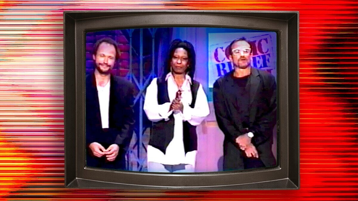 HBO’s Chris Albrecht credits Andy Kaufman co-conspirator Bob Zmuda for bringing the idea to the table, according to oral history Tinderbox: HBO’s Ruthless Pursuit of New Frontiers. Over dinner one night, “(Zmuda) said, ‘We should do Live Aid, but instead of musicians, we should use comics.’” The idea was a natural for HBO, known for its stand-up specials with the country’s biggest comedy stars. Albrecht put together a mid-80s dream team of comedians to host an hours-long funny fundraiser: Whoopi Goldberg, Billy Crystal and Robin Williams.