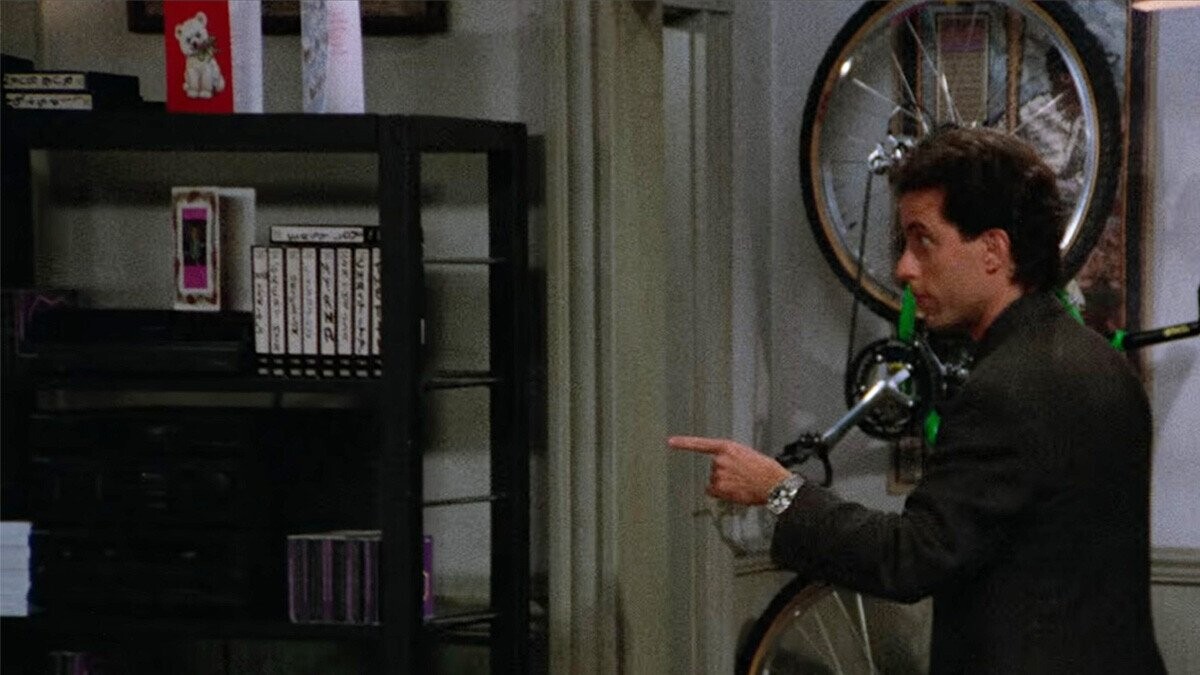 Jerry also has a Benny Hill tape, the justly-forgotten Groucho Marx movie Copacabana, and not one but two copies of True Colors. Why a stand-up comedian in New York would own a back-up copy of a John Cusack political drama was something the writers left to the viewer’s imagination.