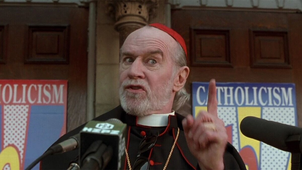 The perpetually controversial Dogma told the story of two fallen angels, banished from heaven and played by Matt Damon and Ben Affleck, who seek to regain their place in the the holy kingdom (or destroy all of existence trying) while God is trapped in a corporeal form. Smith crafted the world of his divine comedy from the Catholic, well, dogma, with Carlin’s character, the marketing-minded dignitary and showman Cardinal Glick, playing a pivotal role in the scheme. In order to craft a hip, cool, modern rebrand to attract potential young Catholics, Glick plans on unveiling the church’s newest symbol, the crucifix-replacing “Buddy Christ,” at a ceremony that will offer all who enter his church a plenary indulgence on the house, including any secret angels.