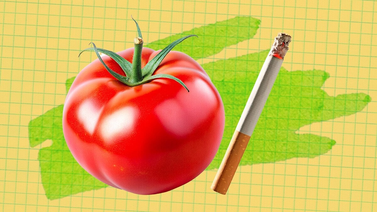 While tomatoes predictably contain much less nicotine than tobacco, scientists find it useful to compare the quantity there to the amount of nicotine you get from secondhand smoke. To get the same nicotine hit as spending three hours around passive smoke, you could eat 250 grams of ripe tomato, which is around two medium fruits. If the tomato’s not ripe, you need just 100 grams, and if the tomatoes are pureed, you get that hit from just 23 grams.
