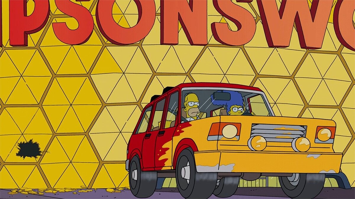Season 34’s “Treehouse of Horror XXXIII” features perhaps the most meta “Treehouse” segment ever: “Simpsons World.” It begins with a clip from the legendary “Marge vs. the Monorail,” in which Homer is explaining to his family how the monorail works. The scene goes on as normal until Marge discovers a family of possums living on the monorail, and just as Homer is about to utter the classic line, “I call the big one Bitey,” two frat dudes jump in and say the line with him. They then pour beer down Homer’s throat.