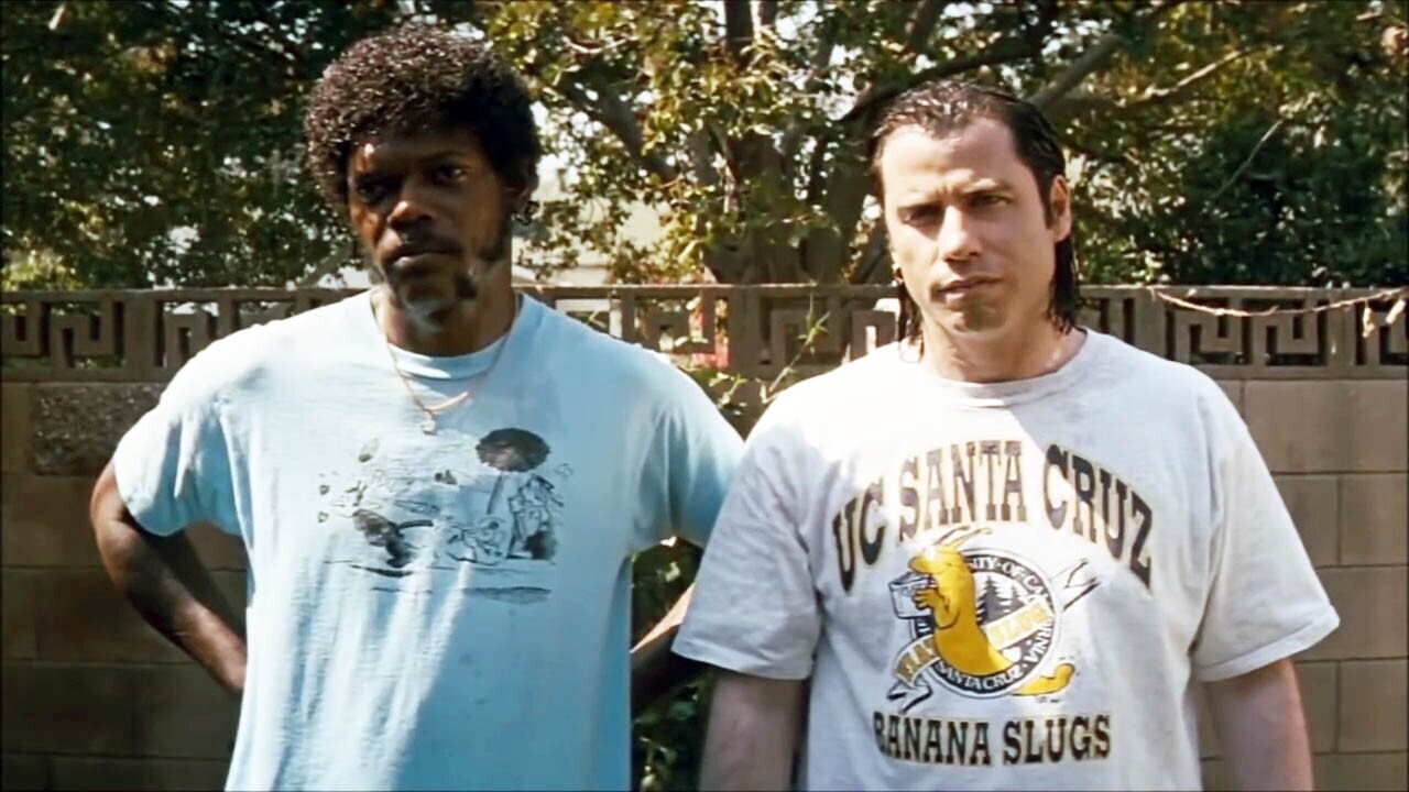 He’s right. Vega wearing a UC Santa Cruz Banana Slugs T-shirt doesn’t exactly scream “dangerous mob goon.” Then again, Jules points out that Jimmie is in no position to laugh: “Ha ha ha. They’re your clothes, motherfucker.”