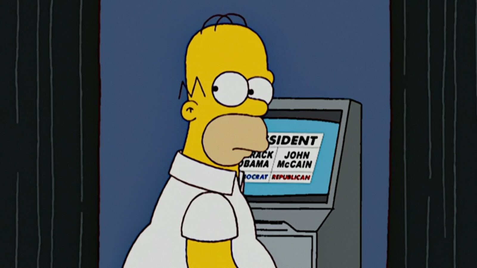 In 2023, NBC reported that Fox’s “lengthy list of trial exhibits” included four clips from the long-running cartoon, including the opening to Season 20’s “Treehouse of Horror XIX,” in which Homer attempts to vote for Barack Obama, but the electronic machine keeps changing his selection to “John McCain” before eventually killing him.