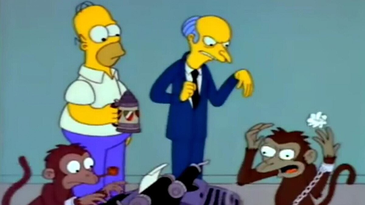 The infinite monkey theorem states that a monkey hitting keys at random on a typewriter for an infinite amount of time will “almost surely” type any given text eventually, including the complete works of William Shakespeare or an original novel that has the potential to become the best-selling book of all time. The first recorded mention of this mathematical concept came from French mathematician Émile Borel in 1913, but the first megalomaniacal multi-millionaire to attempt to turn the infinite monkey theorem into a business model was Montgomery Burns in the 1993 all-time classic Simpsons episode “Last Exit to Springfield.”