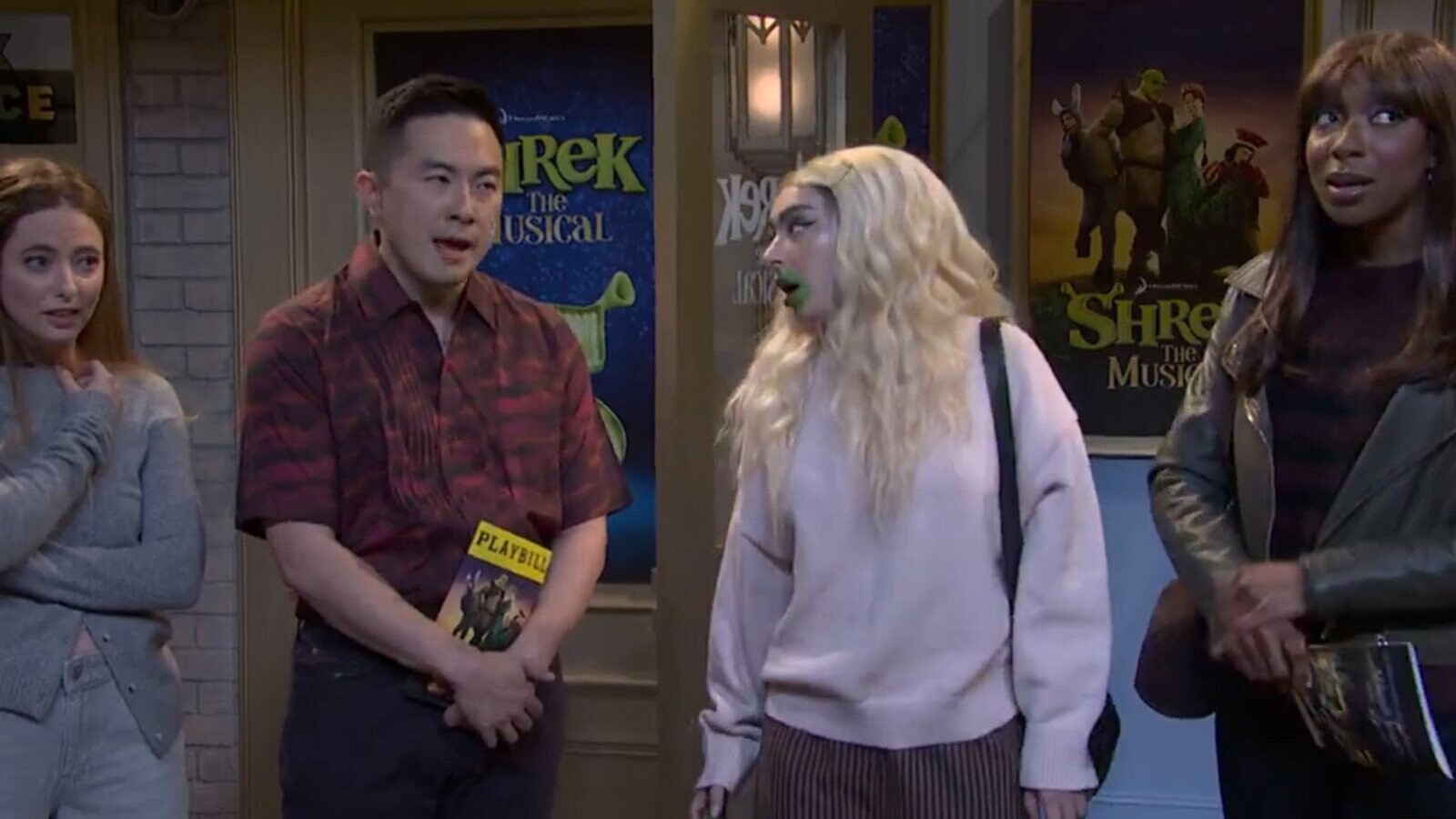 This week’s Charli XCX-centric episode included a sketch in which the singer is caught with green makeup all over her face and hands, following a performance of Shrek: The Musical, thus indicating that she had hooked up with the Broadway actor playing the flatulating ogre. But a number of people on social media responded to the sketch with accusations that it had copied a routine from the YouTube channel Smosh.