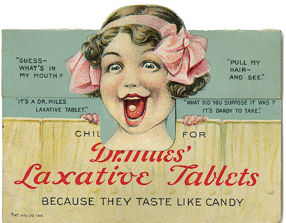 This advertisement from 1910 came in the form of a layered insert. When you pulled on the top, it drew one section out, and the contents of the child’s mouth became visible. Why, it’s a laxative tablet! You’d never have guessed that (unless you read the giant text, which said, “Laxative Tablets”).