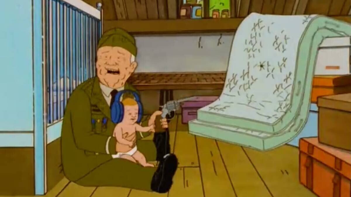 ronaldrios’ thesis hinges on a scene from the King of the Hill Season Five episode “When the Cotton Comes Marching Home,” a storyline that delivered a scathing satire on how America treats its veterans. In the episode, Hank discovers that Cotton is living at the VFW after running out of money, and is struggling to support his son Good Hank and his wife Didi. After numerous additional financial setbacks, some disgraces to his military career and a disastrous attempt to re-join the workforce, Cotton retreats to the VFW with his son and his gun as Hank fears his father will commit suicide in order to secure a life insurance payout for his preferred progeny.