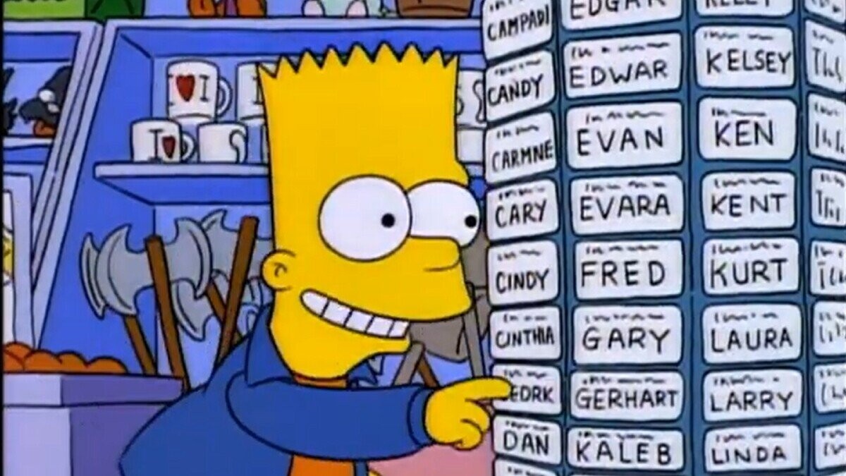 As legendary Simpsons writer, producer and showrunner Bill Oakley pointed out, there are even more jokes stuffed into this short scene about Bart failing to find a personalized license plate in the Itchy & Scratchy Land gift shop than the ones that terminally online Simpsons fans know by heart. While the hard work some artist put into alphabetizing the names should, apparently, not go unrecognized, the secret star of this scene is whoever planted names like “Campadi,” “Cedrk" and “Gerhart” into the few visible frames — hats off to whichever Edwar came up with that gag.