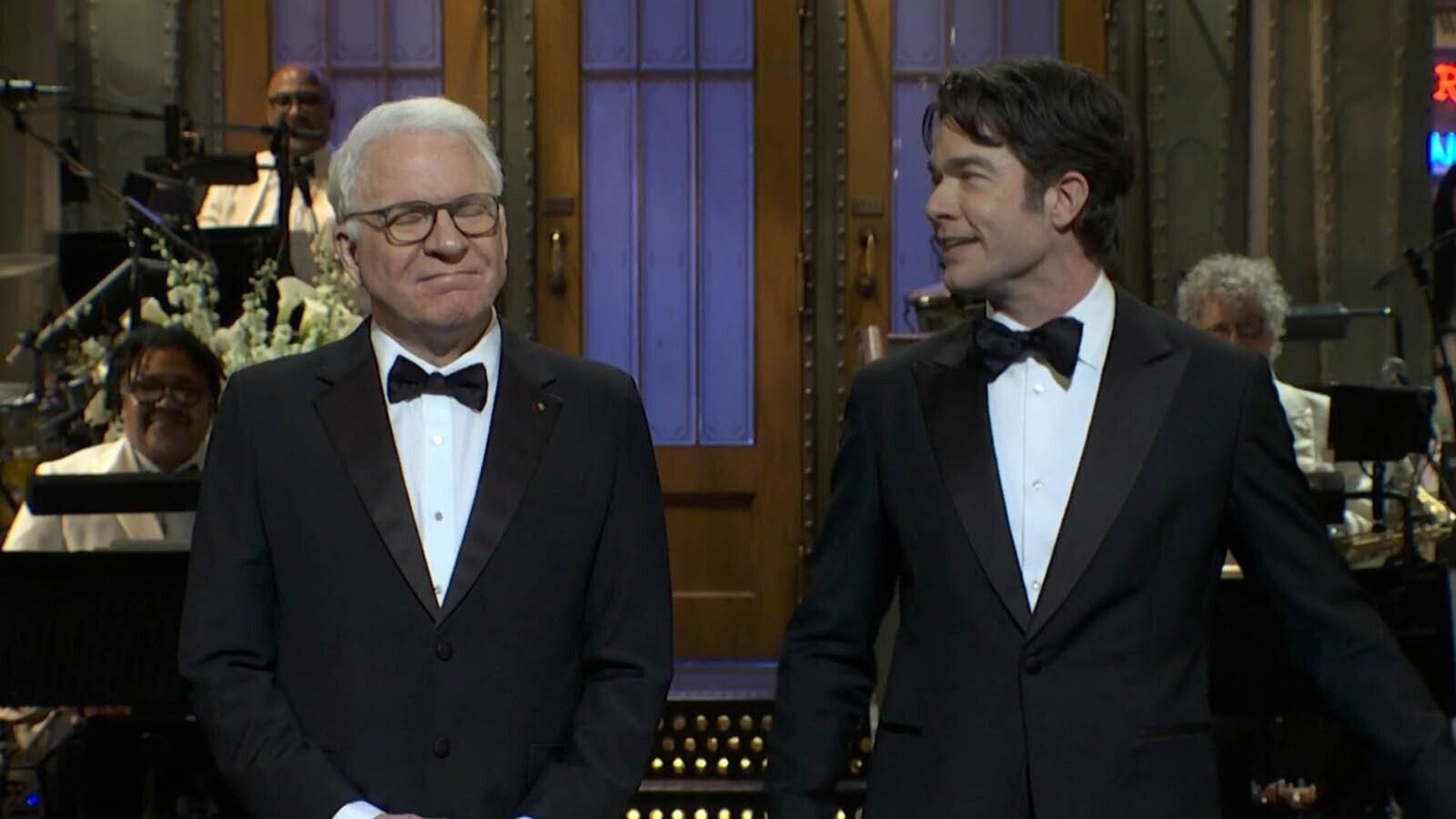 After a funny tribute to SNL’s writers — a quick cut to a group of actual Saturday Night Live scribes standing outside 30 Rock — one of the show’s actual writers joined Martin on stage: John Mulaney. With Martin praising the writers, it was time for a writer to say something about the hosts.